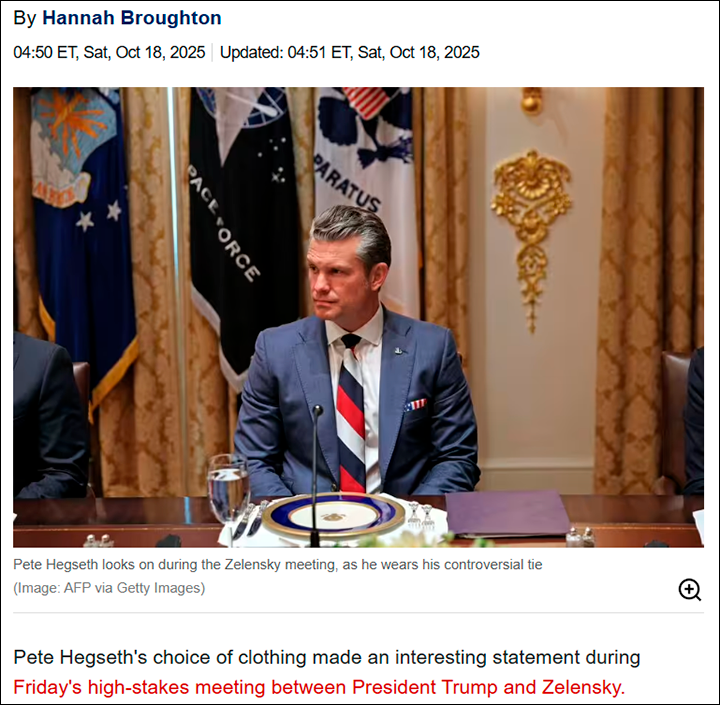 Акцент на небрежном внешнем виде Владимира Александровича и завуалированная насмешка над стилем милитари стали настоящим коньком американского президента. Настойчивое игнорирование правил и норм поведения, этикета со стороны Зеленского – своеобразная фронда. Принимающая сторона в долгу не осталась. Журналисты обратили внимание на то, что военный министр США Пит Хегсет сознательно надел бело-сине-красный галстук в цветах русского триколора. Хотя совсем недавно грозил России карами небесными за несговорчивость.