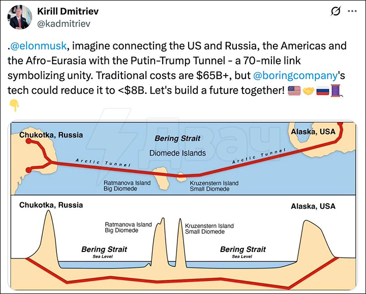 Гендиректор РФПИ предложил Илону Маску соединить Чукотку и Аляску тоннелем. Зеленскому идея "не зашла". Скриншот страницы Кирилла Дмитриева в соцсети Х.