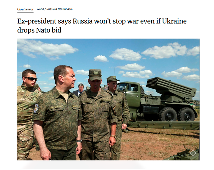 Когда Россия верила в мощь своих танковых армад, яростные реплики Медведева казались лишними. Когда Россия начала надеяться на дипломатию, гнев Медведева воспринимался как утрированные угрозы "плохого полицейского". Когда же у России не осталось никаких надежд, тон Медведева внезапно стал голосом трезвого осознания ситуации.
