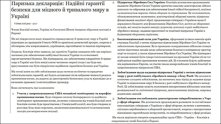 Впрочем, в итоговой декларации, черновики которой появились в зарубежных СМИ, всё не так гладко. Там лишь пять пунктов – и без конкретики. Но там есть упоминания о том, что США должны "руководить организацией контроля за соблюдением (будущего) режима прекращения огня" (о чём это?), что помощь Украине продолжится (а кто сомневался?), что "коалиция желающих направит многонациональные войска". Плюс указано "юридическое обязательство поддерживать Украину в случае будущего нападения России" (речь в том числе об использовании военных возможностей и разведки), а также имеется пункт о развитии "долговременного оборонного сотрудничества с Украиной".
