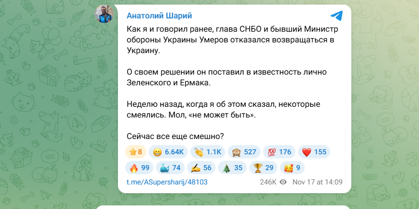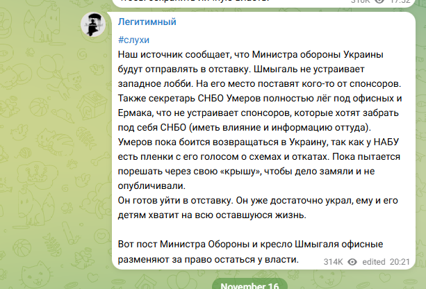 Источники украинского телеграм-канала "Легитимный" утверждают, что у НАБУ имеются записи "прослушки", на которых записан Умеров (часть таких записей, обличающих соратников Зеленского, уже обнародована). Секретарь СНБО боится, что после его возвращения плёнки будут использованы для привлечения его к уголовной ответственности.