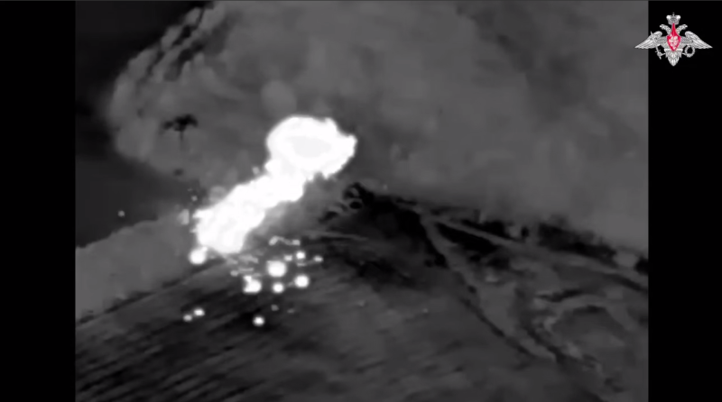 В Минобороны без лишних слов разместили видео с камеры наблюдения дрона-разведчика. Он производил объективный контроль удара возмездия по позициям ВСУ.