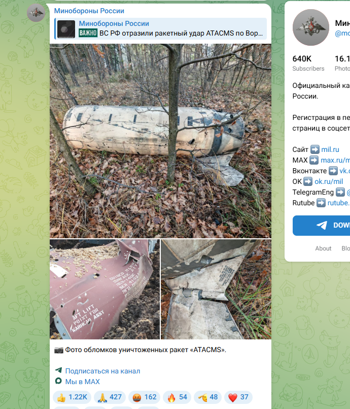 В Минобороны России рассказали: ВСУ ударили американскими ракетами ATACMS по Воронежской области. Атака была совершена 18 ноября в 14:31.