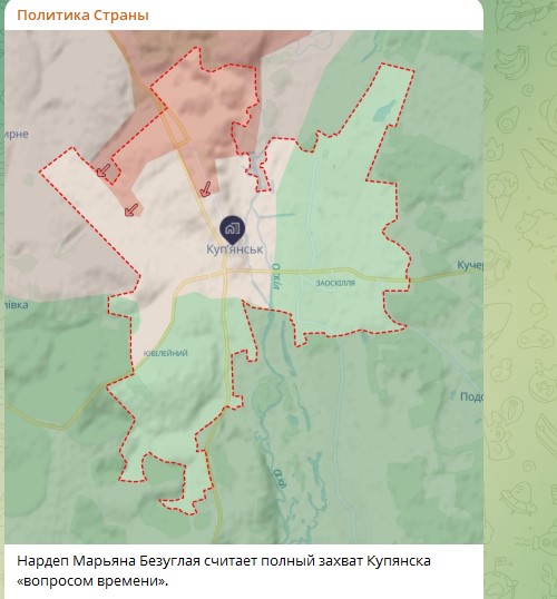 Украинский депутат Марьяна Безуглая заявила о том, что взятие Купянска русской армией уже стало "вопросом времени". По её словам, переход города под контроль России - это уже необратимый процесс.
