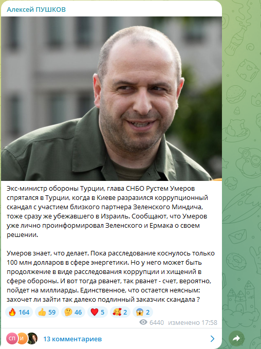 Для начала он отправился в Турцию, где якобы принялся проводить некие переговоры по обмену пленными (с кем говорил - неясно). По последним данным, Умеров уже в США. Интересно, что сумел уехать с Украины до того, как в дверь постучали следователи НАБУ, и один из главных фигурантов, близкий друг Зеленского и его "кошелёк" Тимур Миндич. Он теперь отсиживается в Израиле.