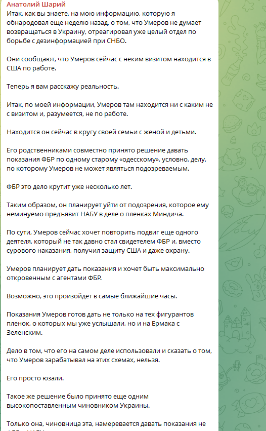Умеров планирует дать показания и хочет быть максимально откровенным с агентами ФБР… Показания готов дать не только на тех фигурантов плёнок, о которых мы уже услышали, но и на Ермака с Зеленским,