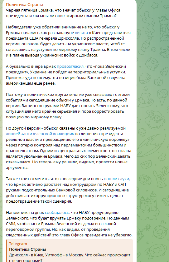 Поскольку НАБУ - орган, напрямую подчиняющийся американцам (если что, у них есть отдельный офис для офицера-куратора, сотрудника ФБР), то многие эксперты тут же пришли к выводу, что тут есть весьма явная взаимосвязь. Вчера Ермак отвергает план США, а сегодня его вовсю "прессуют" те, кому американцы отдают приказы.