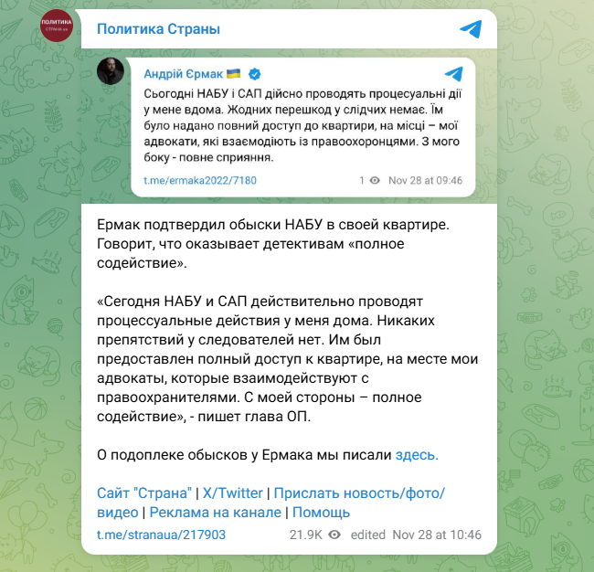 Сам серый кардинал вышел на связь через несколько часов после начала обысков в его квартире. Непривычно вежливый и притихший Ермак никому уже не грозит и не брызжет слюной. Присмиревший дружок Зеленского лебезит: мол, детективам НАБУ и САП никто не оказывает противодействия, им "предоставлен полный доступ в квартиру" (можно подумать, у Ермака была альтернатива).