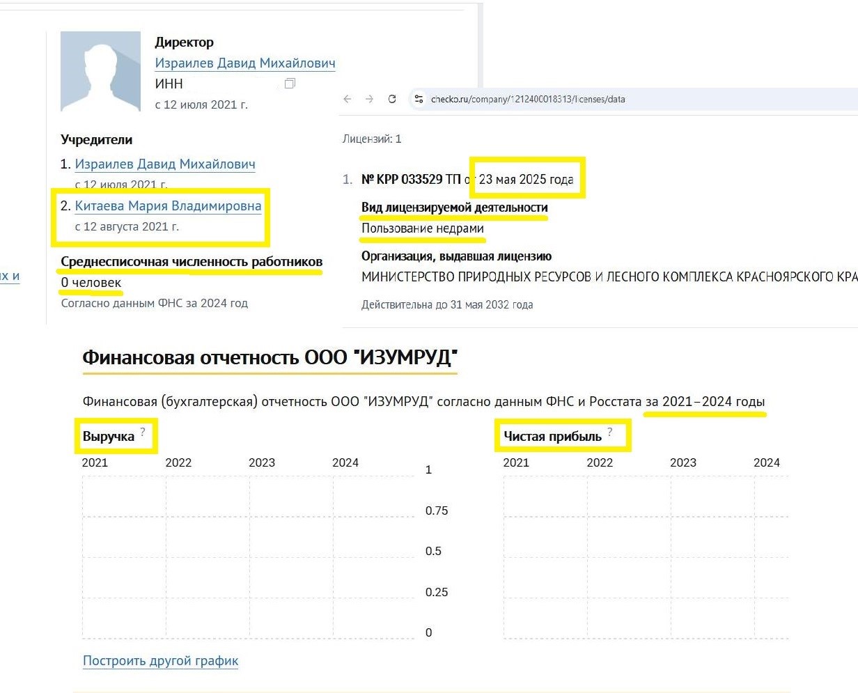 С момента оформления ООО "Изумруд" компания существовала исключительно на бумаге — ни офиса, ни одного работника, никаких контактов для связи, нулевые финансовая активность и отчётность. И "вдруг" 23 мая 2025 года, когда приговор Тимуру Иванову ещё не был оглашён (заседание состоялось 1 июля), но невесёлый для обворовавшего государство более чем на миллиард рублей бывшего чиновника итог процесса не вызывал сомнений, "Изумруд" получил лицензию на пользование недрами.