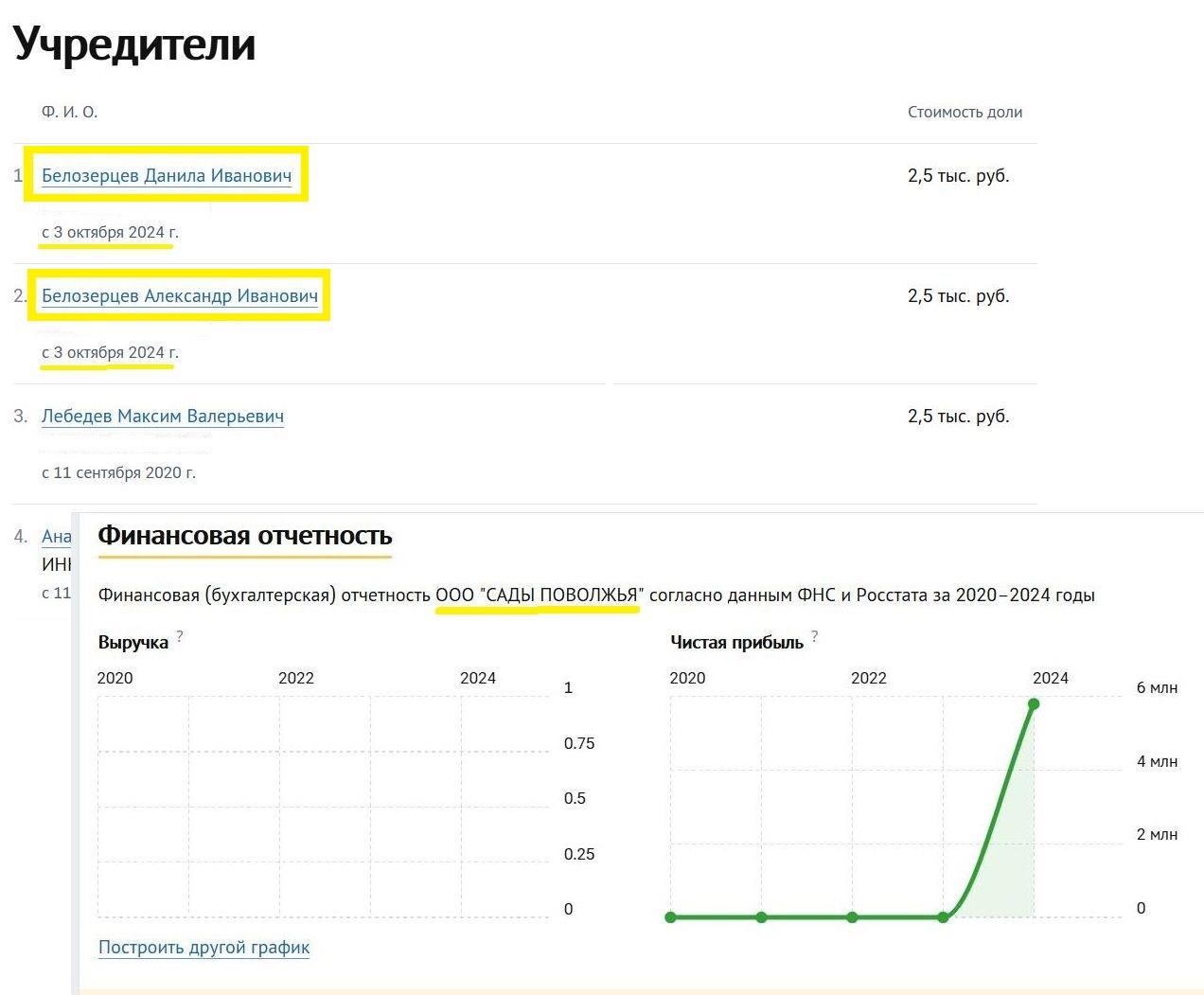 Любопытная история: фирма зарегистрирована в сентябре 2020 года и на протяжении четырёх лет не подавала признаков жизни. И только в 2024-м, когда в состав учредителей ООО были внесены Данила и Александр Белозерцевы, "Сады Поволжья" сразу показали отменный финансовый результат. Компания, в которой числится 1 работник, с полного нуля тут же показала прибыль в почти 6 млн рублей.