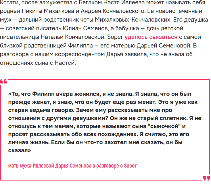 В соцсетях грустно шутят о "не той двери" не для того Филиппа. Теперь речь идёт о новом супруге блогерши Анастасии Ивлеевой Филиппе Бегаке, благодаря которому устроительница "голой вечеринки" породнилась с режиссёром Никитой Михалковым. Правда, сам Бегак не соизволил поставить знаменитых родственников в известность о "прибавлении" в большом семействе. Даже мать нового мужа Ивлеевой не знала об этой свадьбе. Более того, она уверена: её ветреный сын недолго будет с блогершей. "Это я уже как старая ведьма говорю", - устало шутит женщина.