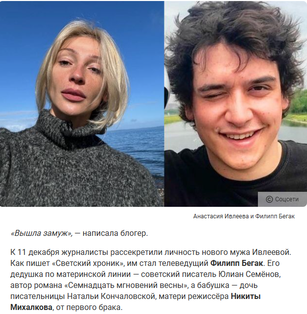 Таким образом, Ивлеева породнилась с семейством Михалковых. Журналисты уточняют - Бегак и Ивлеева заключили брак 10 декабря в Мурманске (ранее блогерша писала в соцсетях, что приехала туда как туристка). Официально эту информацию не подтверждали ни Анастасия, ни Филипп.
